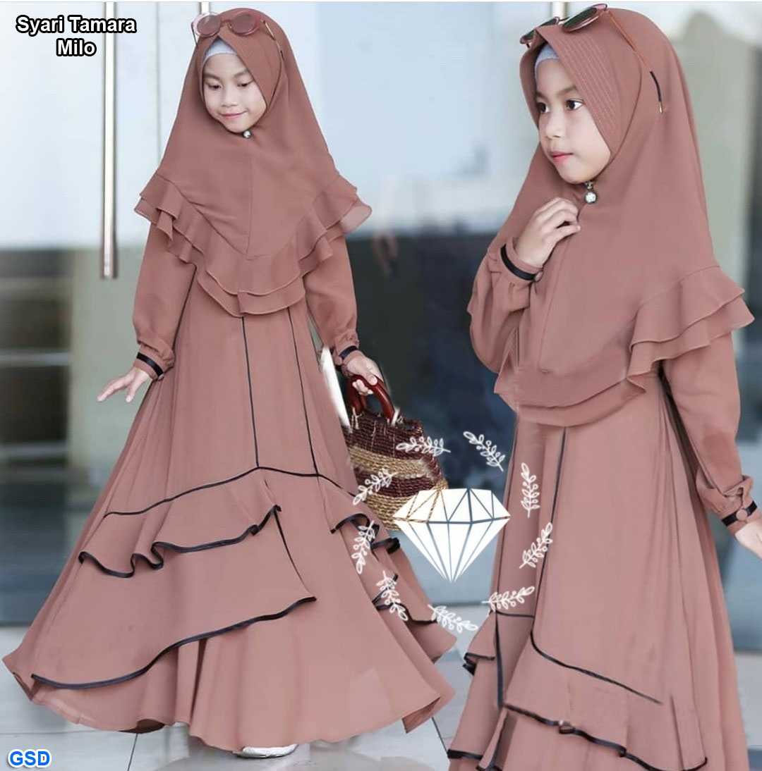 syari tamara mocca@83rb min 3pcs ecer 88rb bahan moscrepe maxi lengan panjang ,pinggang belakang karet atas kancing 1 Ld76cm Pjg90cm +bergo Pjg45cm Fit 5-8thn (No Size tergantung anak) 320gr