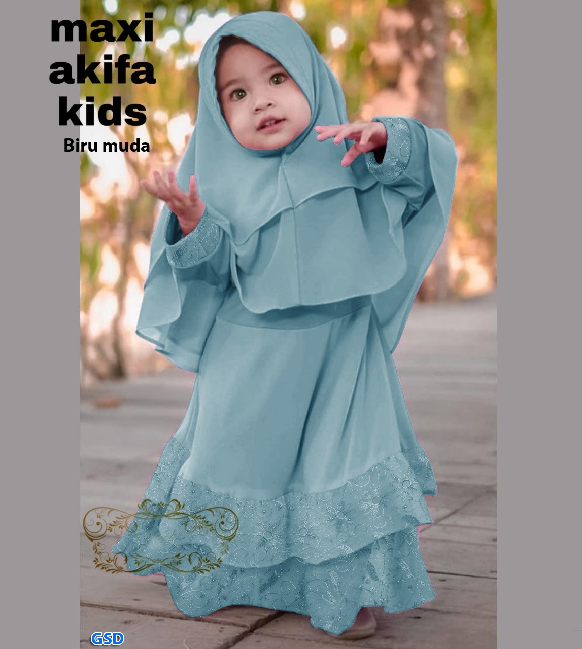 Maxi Akifa kids biru@89rb min 3pcs ecer 94rb bahan moscrepe kombi Ruby lace tile mutiara,maxi lengan panjang pinggang belakang karet ada sleting Ld60cm Pjg69cm + bergo Pjg50cm Fit 3-5thn (No Size,tergantung anak (400gr)