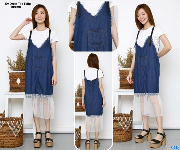 Ov dress tile tulip biru tua@77rb min 3pcs ecer 82rb Outer Saja ,bahan jean tali pundak kulit + ada saku ditengah depan Ld90cm Pjg115cm Tanpa Dalaman Fit L (350gr)
