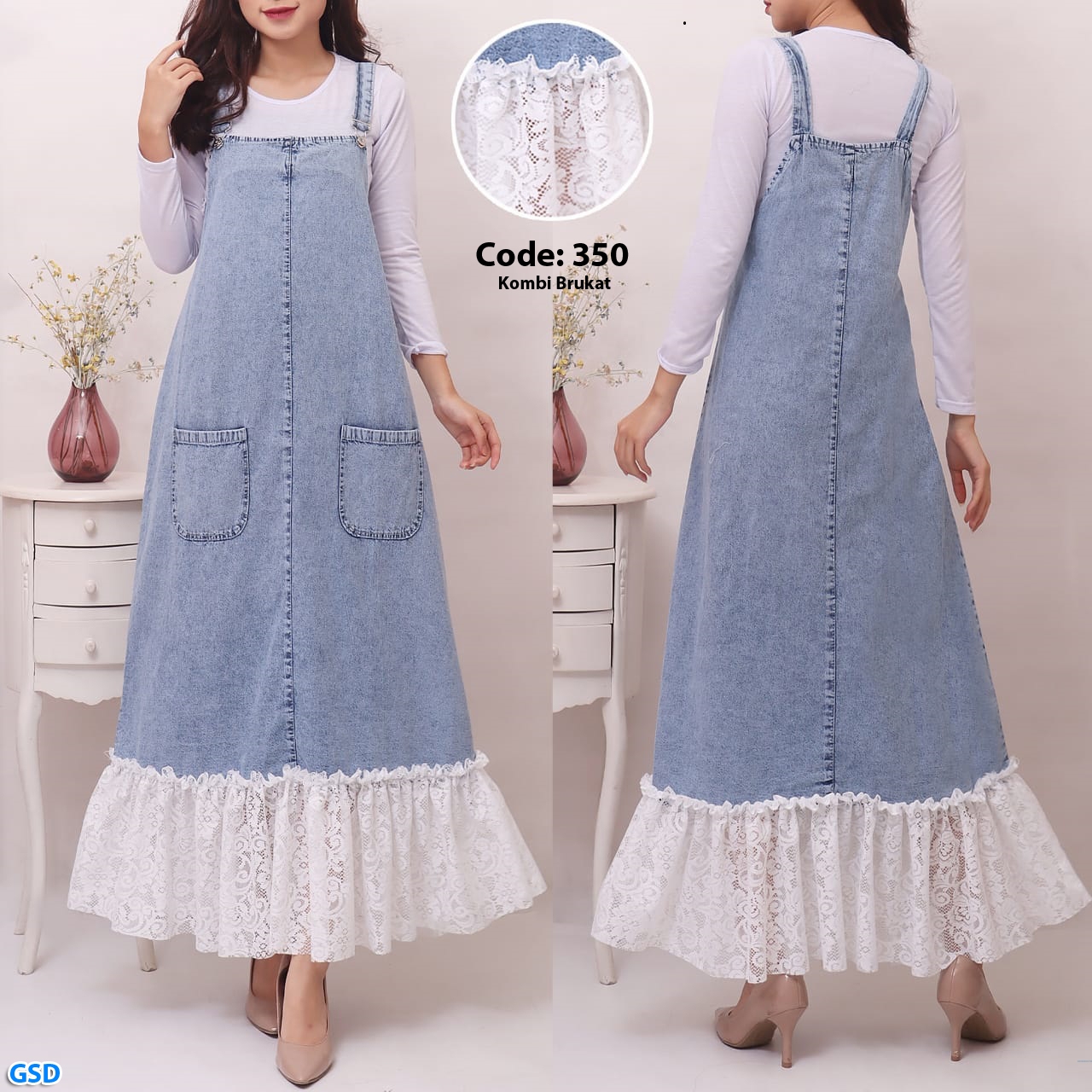 Dress Jeans 350 brukat@110rb min 3pcd ecer 115rb inner kaos putih lengan panjang Ld70cm Pjg47cm + Outer jeans bawah brukat putih ,Saku depan kiri kanan Pjg120cm Fit M (500gr)