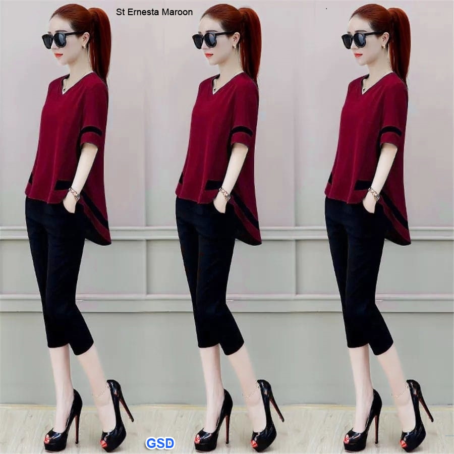 St ernesta maroon@48rb min 3stel ecer53rb Bahan kaos Atasan Ld80cm Pjg50cm + Celana Pinggang karet,saku kiri kanan Pjg72cm Fit M (400gr)